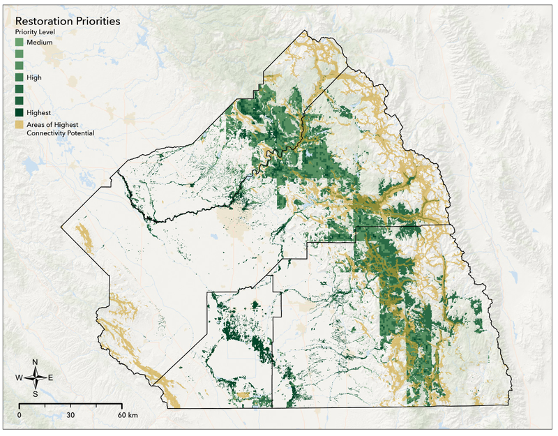 A slide deck for a GIS-based and R coding analysis identifying priority areas for ecological restoration in California's Central San Joaquin Valley using habitat suitability, land use, and climate projections.